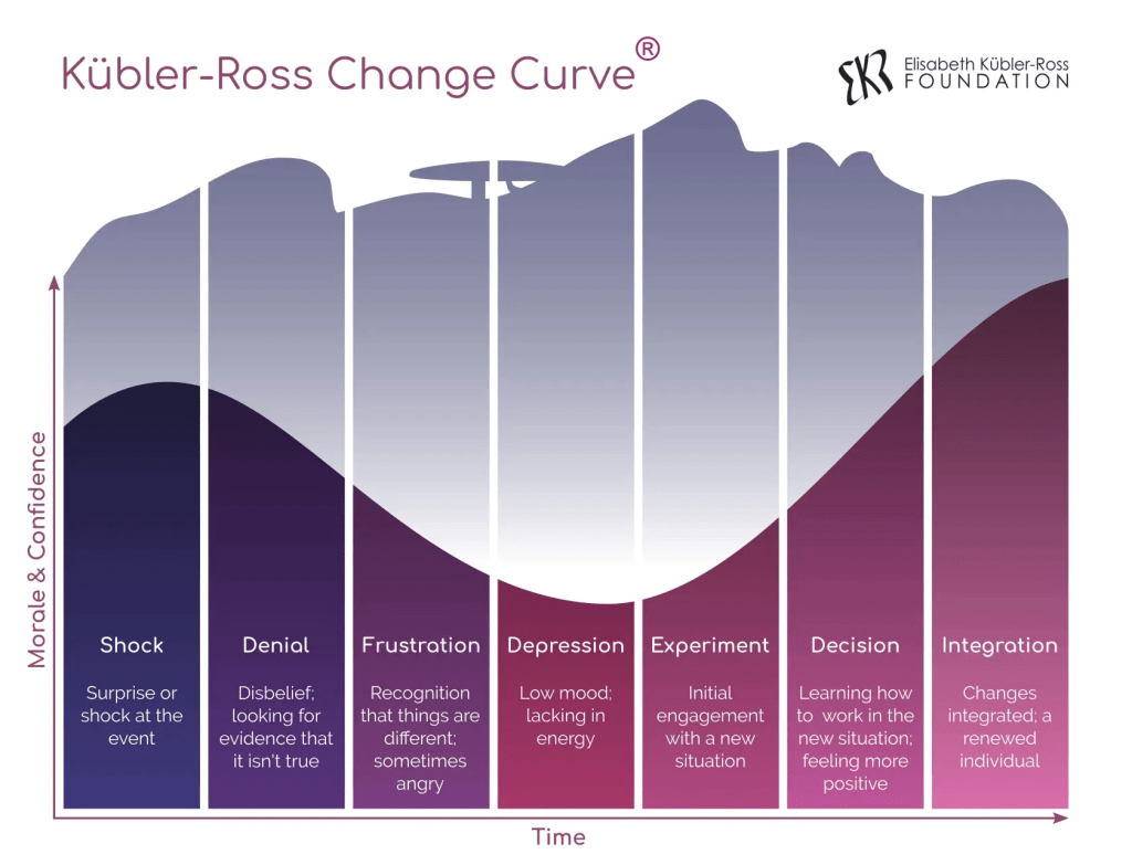 I’ve heard references to the stages of grief before, but I never knew exactly how to pinpoint what they were. I decided to find out about the different stages of grief. I discovered the stages were identified in the late 60’s by Elizabeth Kubler-Ross. The idea of the different stages can be graphed into what they call the Kubler-Ross Change Curve®. This curve can apply to any type of loss. The development of the stages or the curve is just another way to help us understand the emotions around loss and attempt to cope with them. However, even with this model, emotions take up too much space to be put in a box, and not every stage aligns perfectly with how someone may actually feel. Hell, you might not even be able to put a name to what you feel at any given moment. And that is okay. You don’t have to know what the stages are to experience your personal journey through them.
